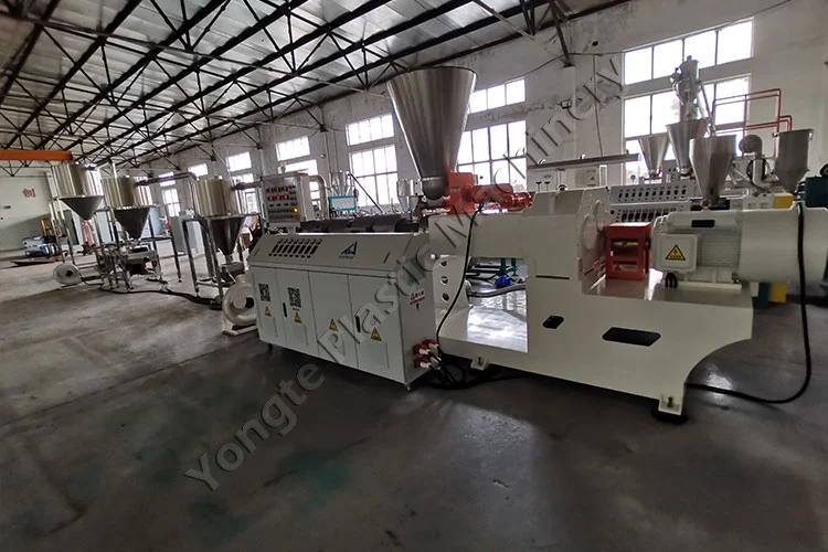 في عام 2024، قمنا بتصميم آلة تكوير مركب PVC مخصصة لعميل بولندي، مصممة خصيصًا لإنتاج حبيبات PVC الرئيسية من حشو PVC وCaCO₃ المعاد تدويره. يمكن تعديل محتوى حشو CaCO₃ بمرونة بين 40% و80% للتوافق مع مواصفات الإنتاج الخاصة بالعميل. تشتمل المكونات الرئيسية على وحدة تغذية أوتوماتيكية، وآلة بثق مخروطية مزدوجة اللولب SJSZ80/156 (محرك 75 كيلو وات مع عاكس تردد ABB، يستهلك ~ 50 كيلو وات أثناء التشغيل المستقر)، وقالب تكوير ساخن لقطع الحبيبات بشكل موحد، ونظام تبريد ونقل سريع للهواء ثلاثي المراحل من الفولاذ المقاوم للصدأ 304. تحقق الماكينة قدرة إنتاجية تبلغ 300-400 كجم/ساعة، وهي مصممة للتشغيل المستمر على مدار الساعة طوال أيام الأسبوع دون أي توقف. تمت عملية التثبيت بسلاسة، بدعم من فريق خبراء Yongte، الذي قدم المساعدة الشاملة. بعد التثبيت، أدى التدريب في الموقع إلى تمكين موظفي العميل من تشغيل المعدات بكفاءة، بينما يضمن الدعم الفني عن بعد عبر التوجيه بالفيديو حلًا سريعًا لأي مشكلات، والحفاظ على الإنتاج دون انقطاع وأعلى مستوى من الأداء.