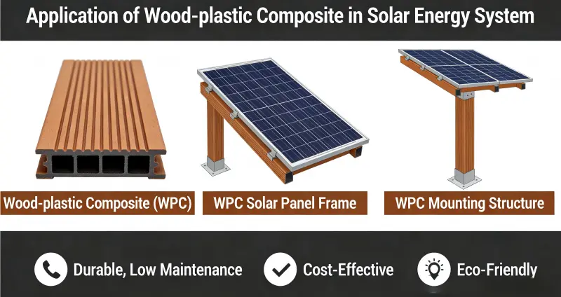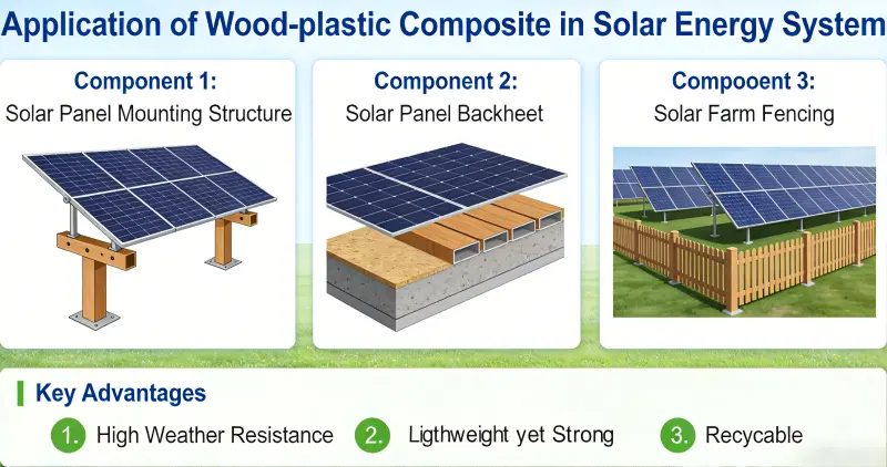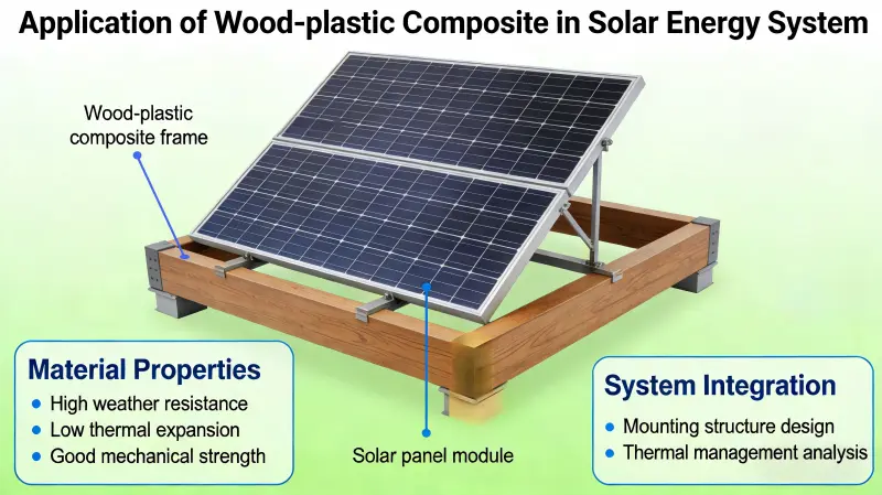 برزت مركبات الخشب والبلاستيك (WPC) كمواد رئيسية في أنظمة الطاقة الشمسية، بما في ذلك حوامل الخلايا الكهروضوئية (PV)، ومحطات الطاقة العائمة، وتكامل المباني الكهروضوئية، وتخزين الطاقة الشمسية المركزة (CSP)، وذلك بسبب خصائصها الصديقة للبيئة، ومقاومة الطقس، وخفيفة الوزن، ومنخفضة الصيانة، وسهلة المعالجة. إنه يحل تدريجياً محل المواد المعدنية والخشبية التقليدية.